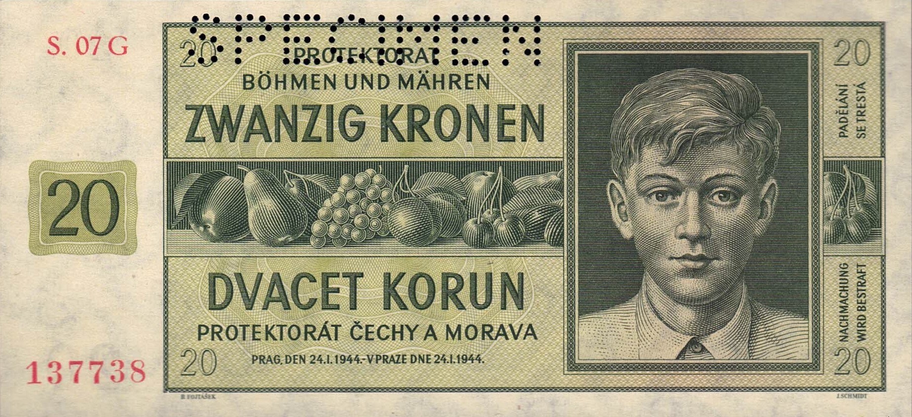 Bohemia & Moravia 20 Korun 1944 Specimen – the texts on the banknote is both in czech and german language, clearly reflecting the era of german occupation, UNC condition.