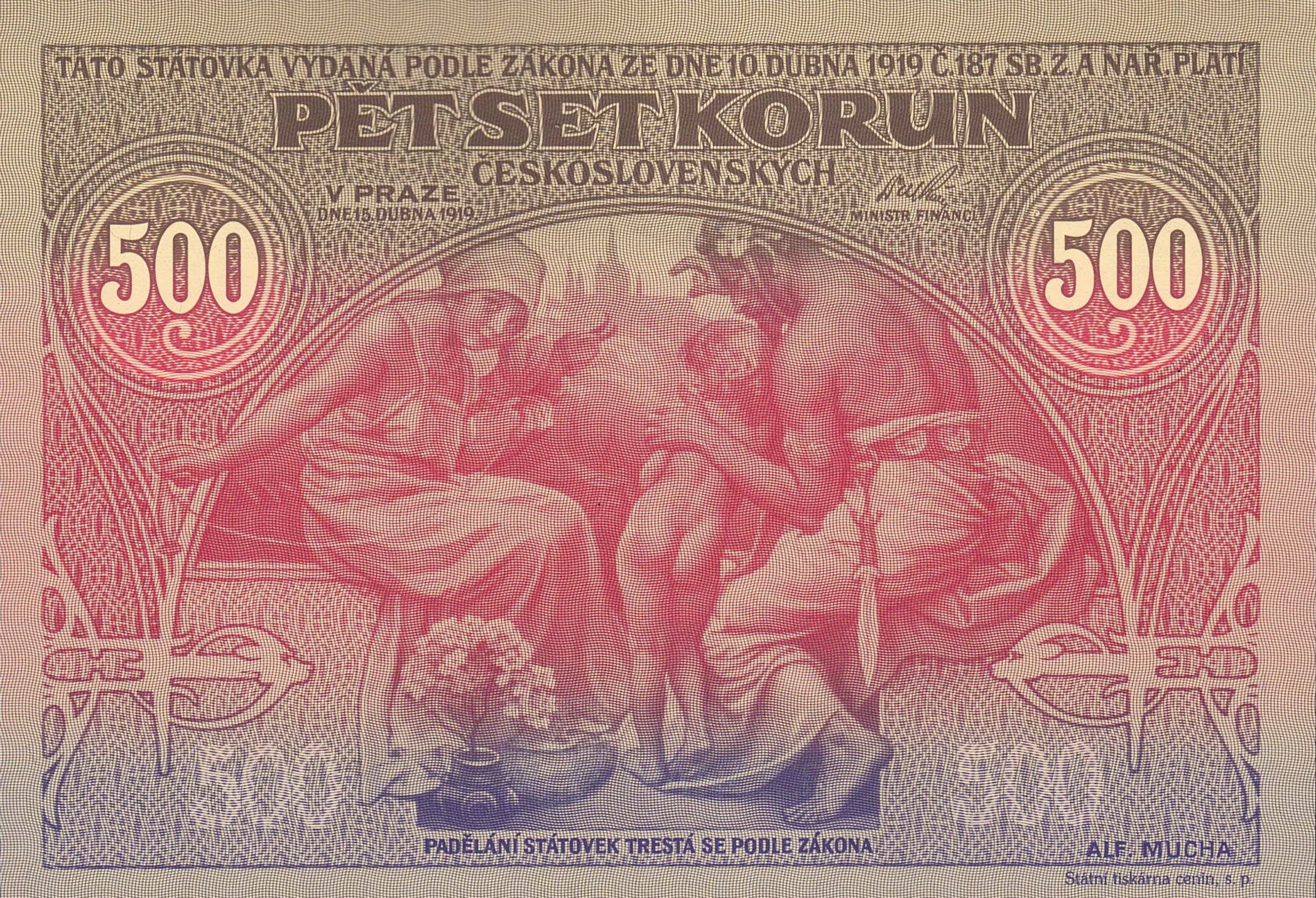 Czechoslovakia 500 Korun 1919 (reprint) – designed solely by Alfons Mucha, printed in Prague, Czechoslovakia, UNC condition. (The banknote on the photo is the official reprint of the banknote from 2020 by city of Ivancice where Alfons was born – using same printing techniques and paper.)