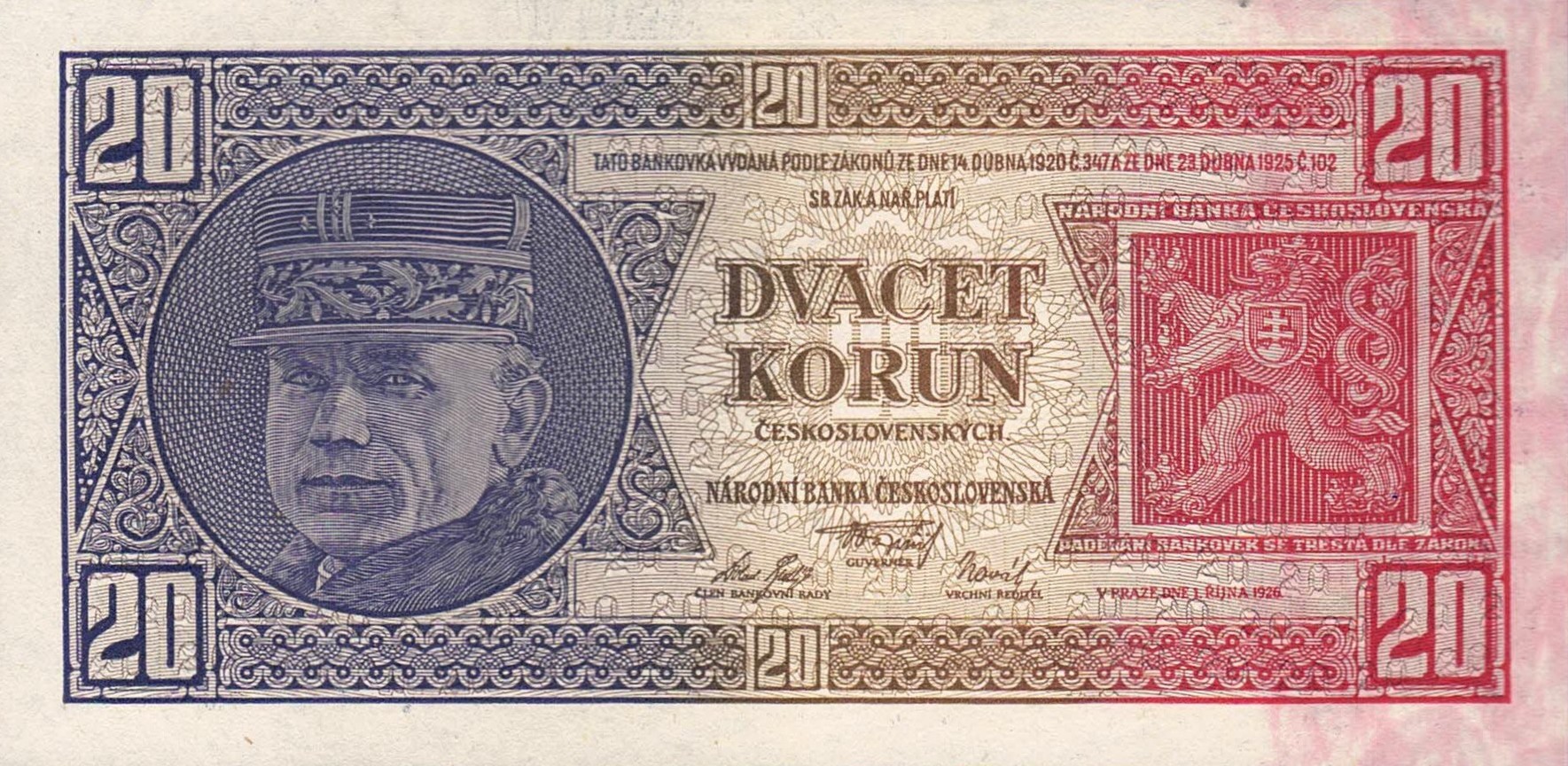 Czechoslovakia 20 Korun 1926 – the banknote from the first Czechoslovak republic, depicting M. R. Štefánik as national hero, not perforated banknote, UNC condition.
